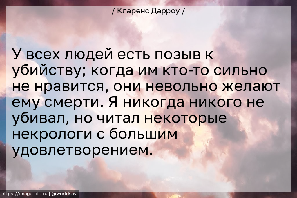 У всех людей есть позыв к убийству; когда им кто-то сильно не нравится, они невольно желают ему смерти. Я никогда никого не убивал, но читал некоторые некрологи с большим удовлетворением.