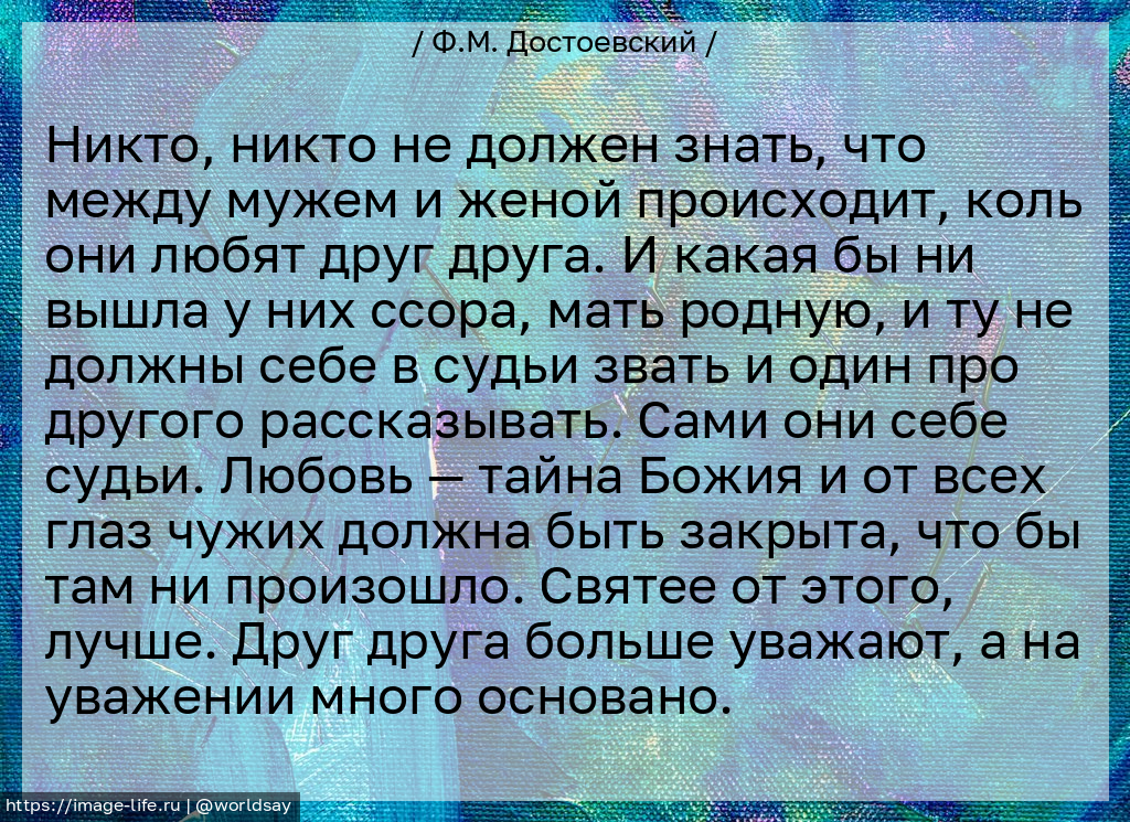 Никто, никто не должен знать, что между мужем и женой происходит, коль они любят друг друга. И какая бы ни вышла у них ссора, мать родную, и ту не должны себе в судьи звать и один про другого рассказывать. Сами они себе судьи. Любовь — тайна Божия и от всех глаз чужих должна быть закрыта, что бы там ни произошло. Святее от этого, лучше. Друг друга больше уважают, а на уважении много основано.