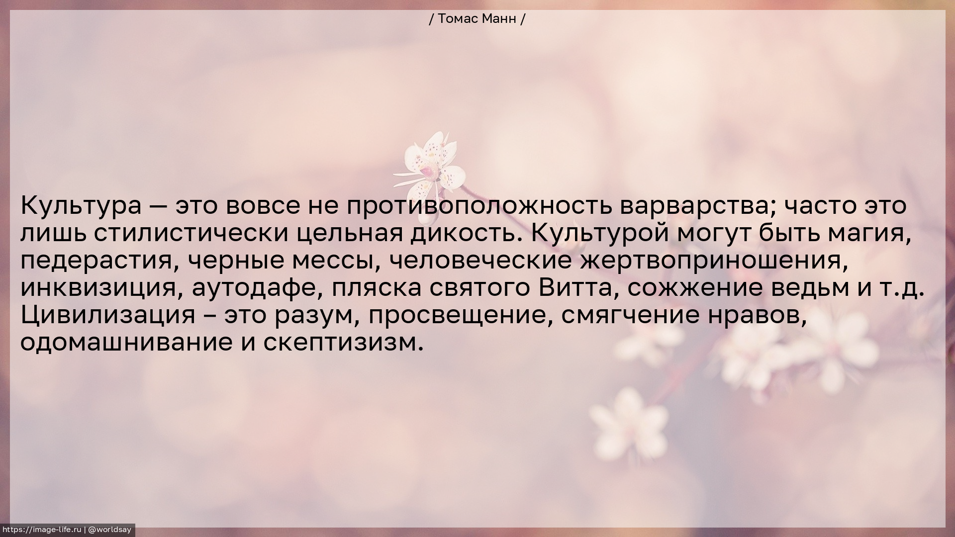 Культура — это вовсе не противоположность варварства; часто это лишь стилистически цельная дикость. Культурой могут быть магия, педерастия, черные мессы, человеческие жертвоприношения, инквизиция, аутодафе, пляска святого Витта, сожжение ведьм и т.д. Цивилизация – это разум, просвещение, смягчение нравов, одомашнивание и скептизизм.