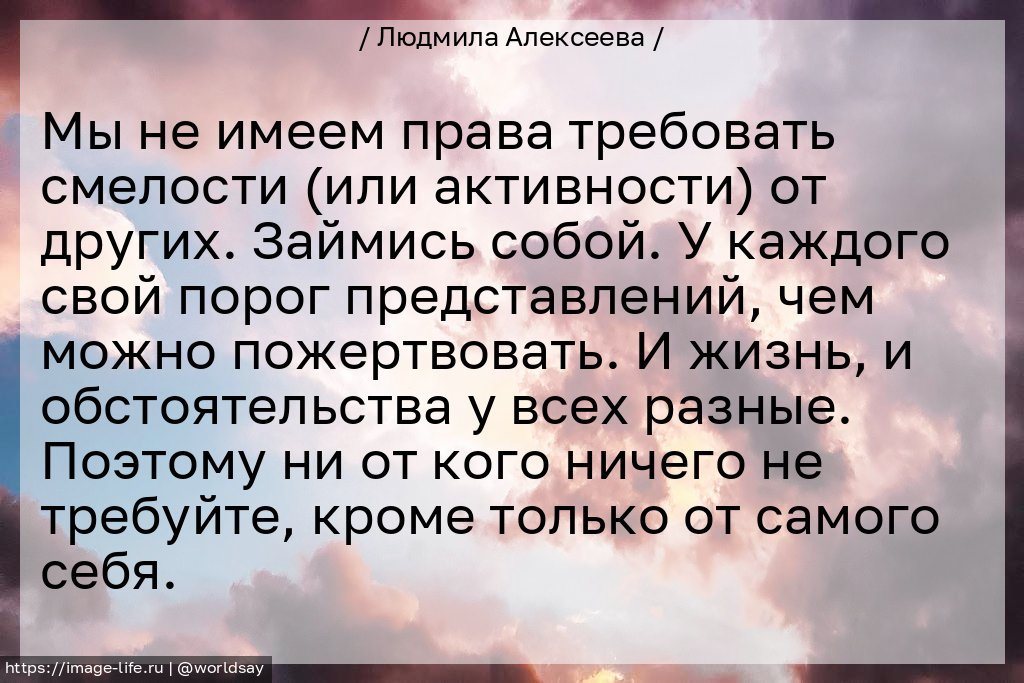 Мы не имеем права требовать смелости (или активности) от других. Займись собой. У каждого свой порог представлений, чем можно пожертвовать. И жизнь, и обстоятельства у всех разные. Поэтому ни от кого ничего не требуйте, кроме только от самого себя.