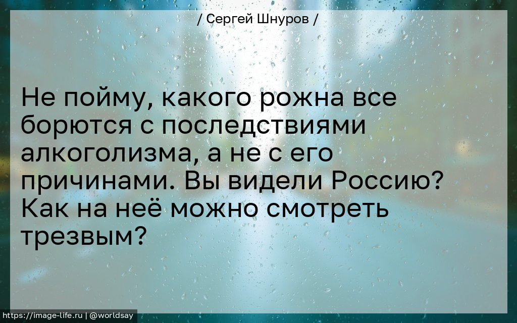 Не пойму, какого рожна все борются с последствиями алкоголизма, а не с его причинами. Вы видели Россию? Как на неё можно смотреть трезвым?