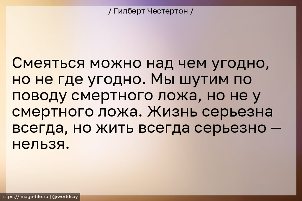 Смеяться можно над чем угодно, но не где угодно. Мы шутим по поводу смертного ложа, но не у смертного ложа. Жизнь серьезна всегда, но жить всегда серьезно — нельзя.