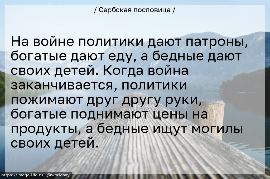 На войне политики дают патроны, богатые дают еду, а бедные дают своих детей. Когда война заканчивается, политики пожимают друг другу руки, богатые поднимают цены на продукты, а бедные ищут могилы своих детей.