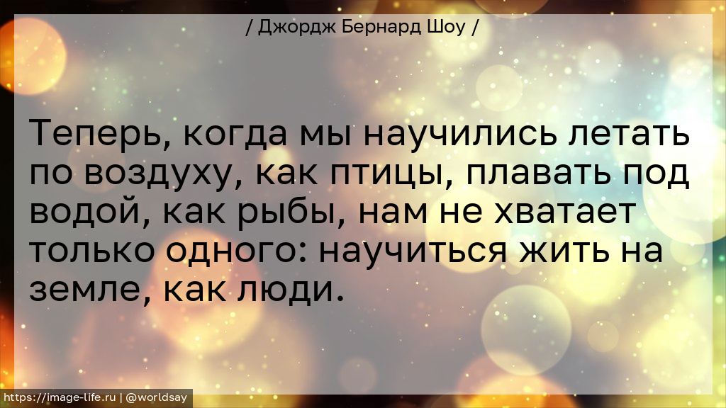 Теперь, когда мы научились летать по воздуху, как птицы, плавать под водой, как рыбы, нам не хватает только одного: научиться жить на земле, как люди.