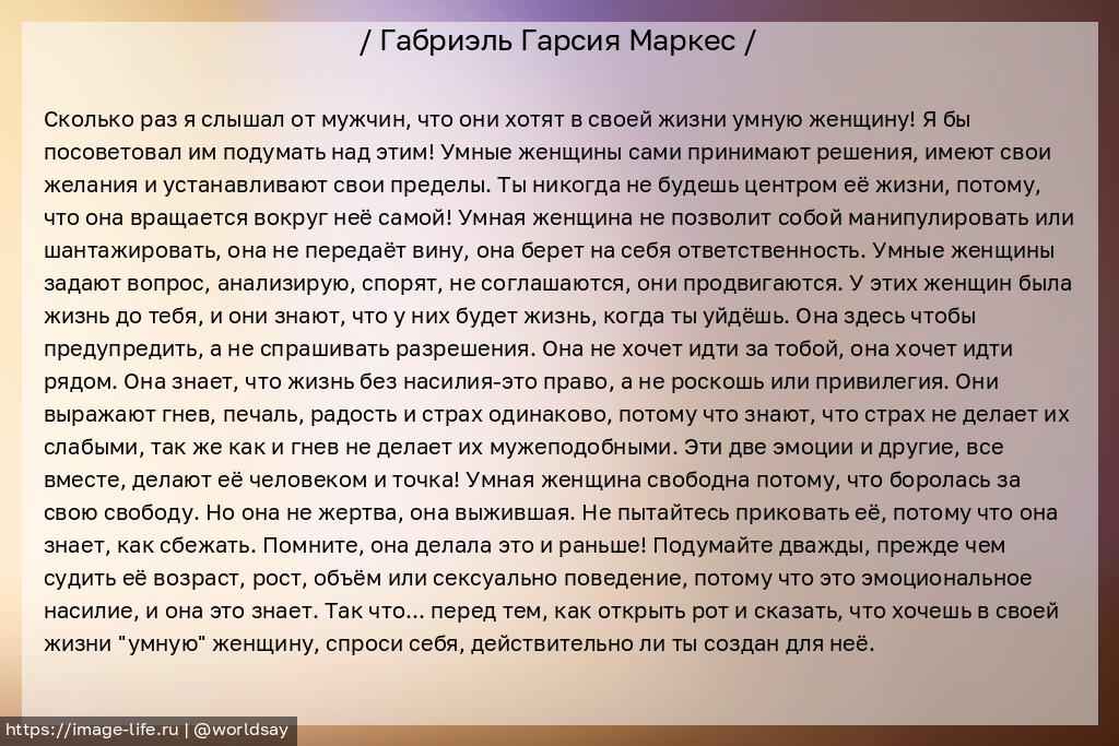 Сколько раз я слышал от мужчин, что они хотят в своей жизни умную женщину! Я бы посоветовал им подумать над этим! Умные женщины сами принимают решения, имеют свои желания и устанавливают свои пределы. Ты никогда не будешь центром её жизни, потому, что она вращается вокруг неё самой! Умная женщина не позволит собой манипулировать или шантажировать, она не передаёт вину, она берет на себя ответственность. Умные женщины задают вопрос, анализирую, спорят, не соглашаются, они продвигаются. У этих женщин была жизнь до тебя, и они знают, что у них будет жизнь, когда ты уйдёшь. Она здесь чтобы предупредить, а не спрашивать разрешения. Она не хочет идти за тобой, она хочет идти рядом. Она знает, что жизнь без насилия-это право, а не роскошь или привилегия. Они выражают гнев, печаль, радость и страх одинаково, потому что знают, что страх не делает их слабыми, так же как и гнев не делает их мужеподобными. Эти две эмоции и другие, все вместе, делают её человеком и точка! Умная женщина свободна потому, что боролась за свою свободу. Но она не жертва, она выжившая. Не пытайтесь приковать её, потому что она знает, как сбежать. Помните, она делала это и раньше! Подумайте дважды, прежде чем судить её возраст, рост, объём или сексуально поведение, потому что это эмоциональное насилие, и она это знает. Так что... перед тем, как открыть рот и сказать, что хочешь в своей жизни "умную" женщину, спроси себя, действительно ли ты создан для неё.