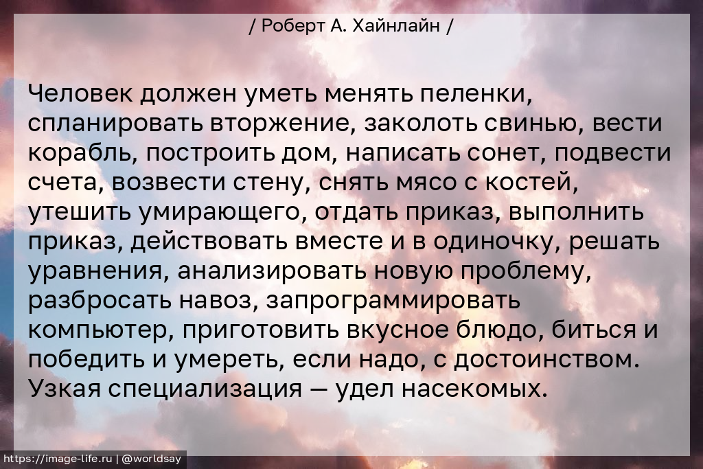 Человек должен уметь менять пеленки, спланировать вторжение, заколоть свинью, вести корабль, построить дом, написать сонет, подвести счета, возвести стену, снять мясо с костей, утешить умирающего, отдать приказ, выполнить приказ, действовать вместе и в одиночку, решать уравнения, анализировать новую проблему, разбросать навоз, запрограммировать компьютер, приготовить вкусное блюдо, биться и победить и умереть, если надо, с достоинством. Узкая специализация — удел насекомых.