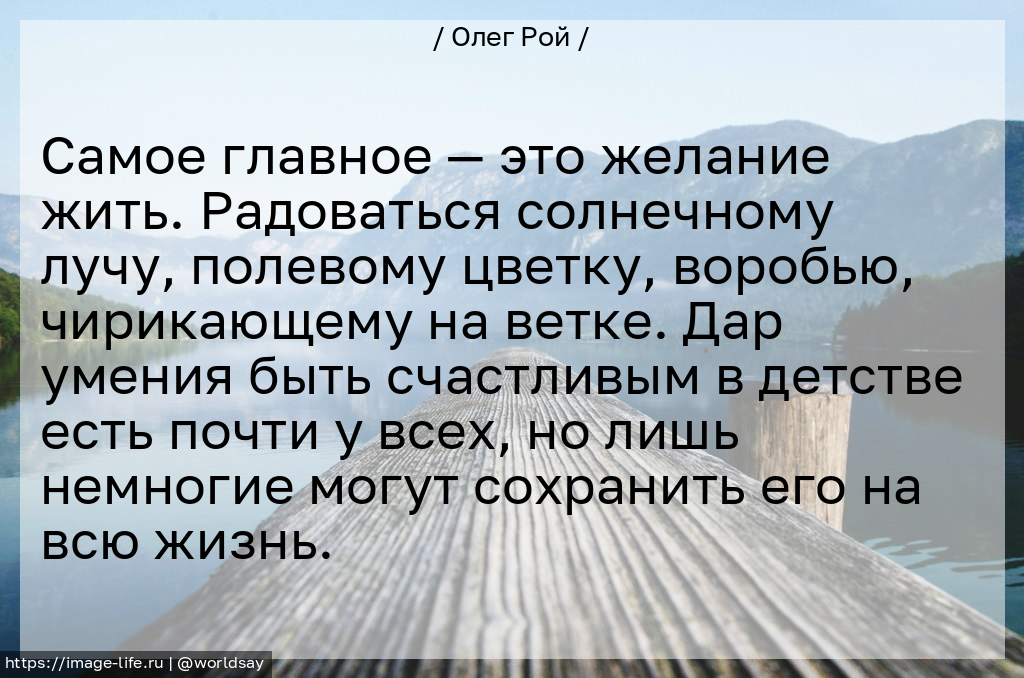 Самое главное — это желание жить. Радоваться солнечному лучу, полевому цветку, воробью, чирикающему на ветке. Дар умения быть счастливым в детстве есть почти у всех, но лишь немногие могут сохранить его на всю жизнь.
