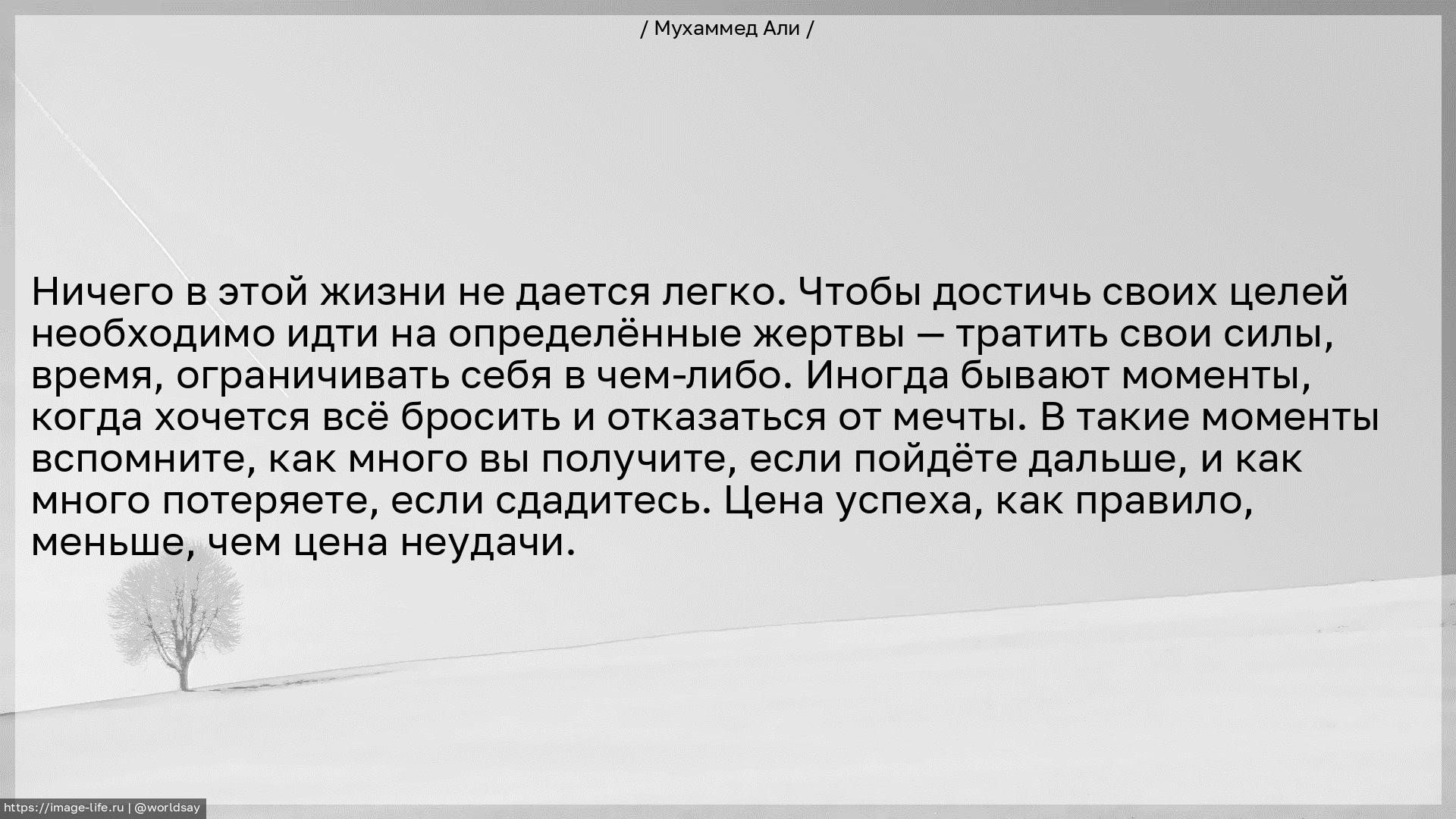 Ничего в этой жизни не дается легко. Чтобы достичь своих целей необходимо идти на определённые жертвы — тратить свои силы, время, ограничивать себя в чем-либо. Иногда бывают моменты, когда хочется всё бросить и отказаться от мечты. В такие моменты вспомните, как много вы получите, если пойдёте дальше, и как много потеряете, если сдадитесь. Цена успеха, как правило, меньше, чем цена неудачи.