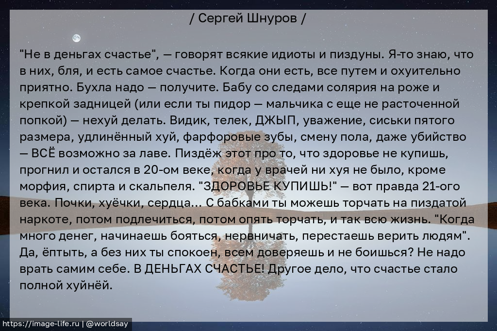 "Не в деньгах счастье", — говорят всякие идиоты и пиздуны. Я-то знаю, что в них, бля, и есть самое счастье. Когда они есть, все путем и охуительно приятно. Бухла надо — получите. Бабу со следами солярия на роже и крепкой задницей (или если ты пидор — мальчика с еще не расточенной попкой) — нехуй делать. Видик, телек, ДЖЫП, уважение, сиськи пятого размера, удлинённый хуй, фарфоровые зубы, смену пола, даже убийство — ВСЁ возможно за лаве. Пиздёж этот про то, что здоровье не купишь, прогнил и остался в 20-ом веке, когда у врачей ни хуя не было, кроме морфия, спирта и скальпеля. "ЗДОРОВЬЕ КУПИШЬ!" — вот правда 21-ого века. Почки, хуёчки, сердца… С бабками ты можешь торчать на пиздатой наркоте, потом подлечиться, потом опять торчать, и так всю жизнь. "Когда много денег, начинаешь бояться, нервничать, перестаешь верить людям". Да, ёптыть, а без них ты спокоен, всем доверяешь и не боишься? Не надо врать самим себе. В ДЕНЬГАХ СЧАСТЬЕ! Другое дело, что счастье стало полной хуйнёй.