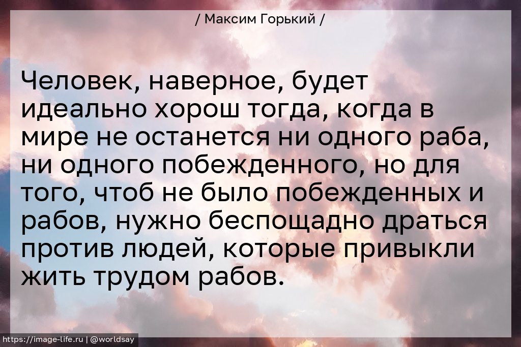 Человек, наверное, будет идеально хорош тогда, когда в мире не останется ни одного раба, ни одного побежденного, но для того, чтоб не было побежденных и рабов, нужно беспощадно драться против людей, которые привыкли жить трудом рабов.