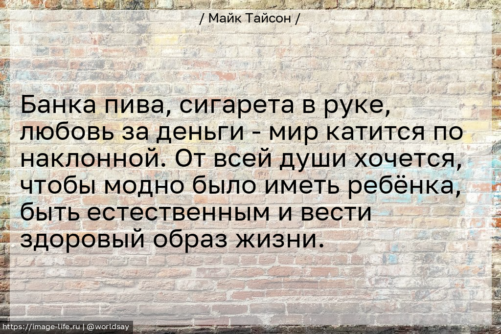 Банка пива, сигарета в руке, любовь за деньги - мир катится по наклонной. От всей души хочется, чтобы модно было иметь ребёнка, быть естественным и вести здоровый образ жизни.