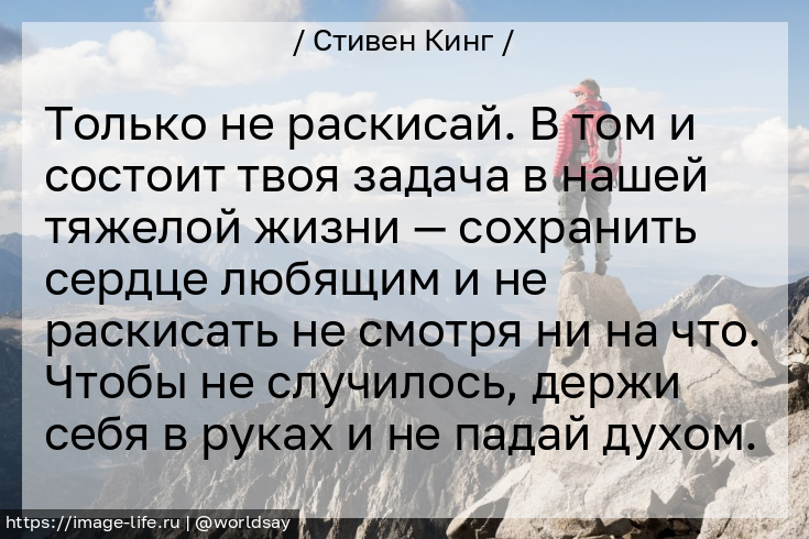 Только не раскисай. В том и состоит твоя задача в нашей тяжелой жизни — сохранить сердце любящим и не раскисать не смотря ни на что. Чтобы не случилось, держи себя в руках и не падай духом.