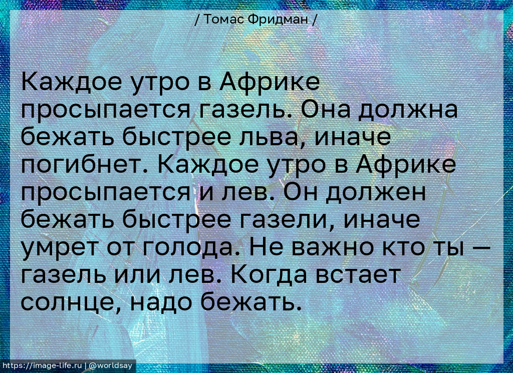 Каждое утро в Африке просыпается газель. Она должна бежать быстрее льва, иначе погибнет. Каждое утро в Африке просыпается и лев. Он должен бежать быстрее газели, иначе умрет от голода. Не важно кто ты — газель или лев. Когда встает солнце, надо бежать.