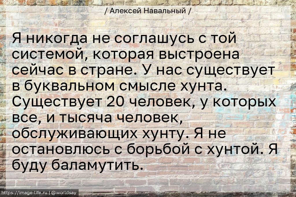 Я никогда не соглашусь с той системой, которая выстроена сейчас в стране. У нас существует в буквальном смысле хунта. Существует 20 человек, у которых все, и тысяча человек, обслуживающих хунту. Я не остановлюсь с борьбой с хунтой. Я буду баламутить.