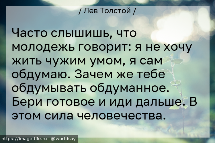 Часто слышишь, что молодежь говорит: я не хочу жить чужим умом, я сам обдумаю. Зачем же тебе обдумывать обдуманное. Бери готовое и иди дальше. В этом сила человечества.