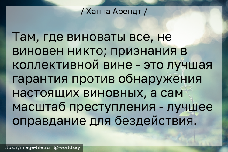 Там, где виноваты все, не виновен никто; признания в коллективной вине - это лучшая гарантия против обнаружения настоящих виновных, а сам масштаб преступления - лучшее оправдание для бездействия.