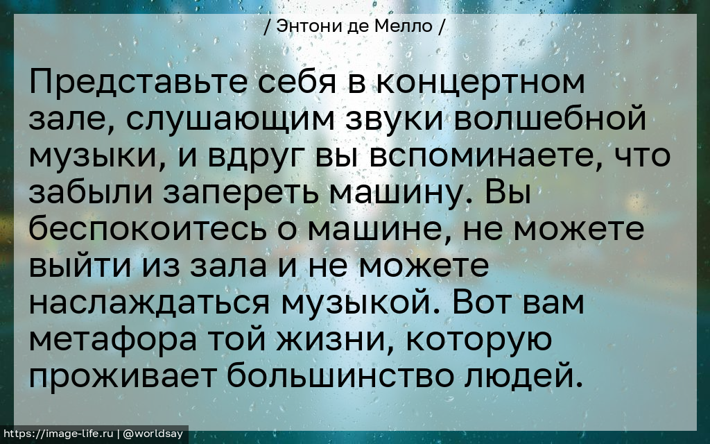 Представьте себя в концертном зале, слушающим звуки волшебной музыки, и вдруг вы вспоминаете, что забыли запереть машину. Вы беспокоитесь о машине, не можете выйти из зала и не можете наслаждаться музыкой. Вот вам метафора той жизни, которую проживает большинство людей.