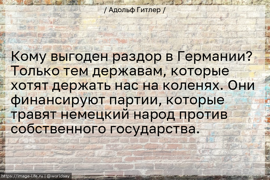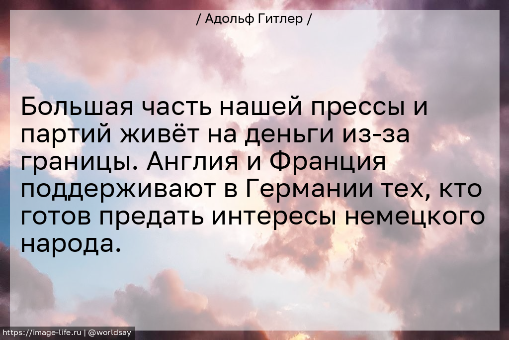 Большая часть нашей прессы и партий живёт на деньги из-за границы. Англия и Франция поддерживают в Германии тех, кто готов предать интересы немецкого народа.