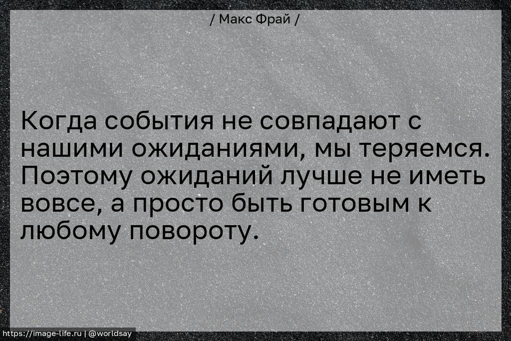 Когда события не совпадают с нашими ожиданиями, мы теряемся. Поэтому ожиданий лучше не иметь вовсе, а просто быть готовым к любому повороту.