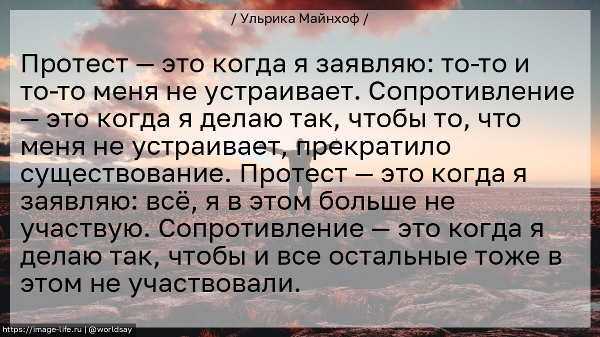 Протест — это когда я заявляю: то-то и то-то меня не устраивает. Сопротивление — это когда я делаю так, чтобы то, что меня не устраивает, прекратило существование. Протест — это когда я заявляю: всё, я в этом больше не участвую. Сопротивление — это когда я делаю так, чтобы и все остальные тоже в этом не участвовали.