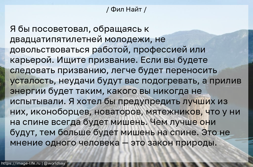 Я бы посоветовал, обращаясь к двадцатипятилетней молодежи, не довольствоваться работой, профессией или карьерой. Ищите призвание. Если вы будете следовать призванию, легче будет переносить усталость, неудачи будут вас подогревать, а прилив энергии будет таким, какого вы никогда не испытывали. Я хотел бы предупредить лучших из них, иконоборцев, новаторов, мятежников, что у ни на спине всегда будет мишень. Чем лучше они будут, тем больше будет мишень на спине. Это не мнение одного человека — это закон природы.