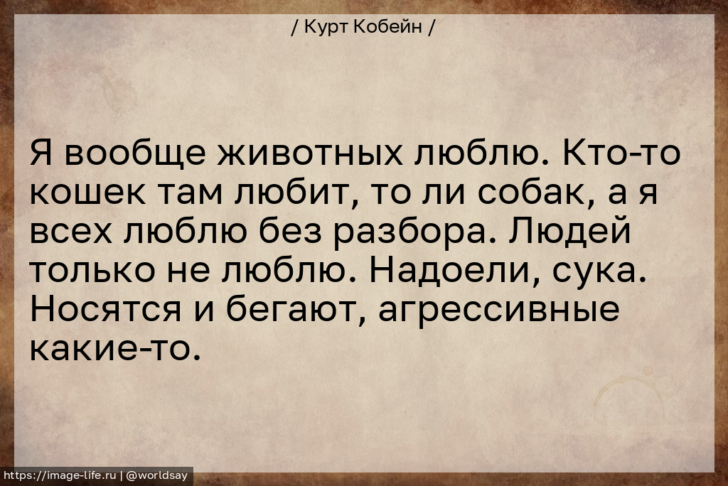 Я вообще животных люблю. Кто-то кошек там любит, то ли собак, а я всех люблю без разбора. Людей только не люблю. Надоели, сука. Носятся и бегают, агрессивные какие-то.