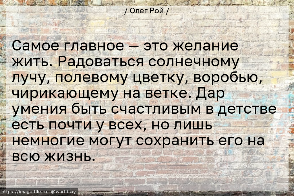 Самое главное — это желание жить. Радоваться солнечному лучу, полевому цветку, воробью, чирикающему на ветке. Дар умения быть счастливым в детстве есть почти у всех, но лишь немногие могут сохранить его на всю жизнь.