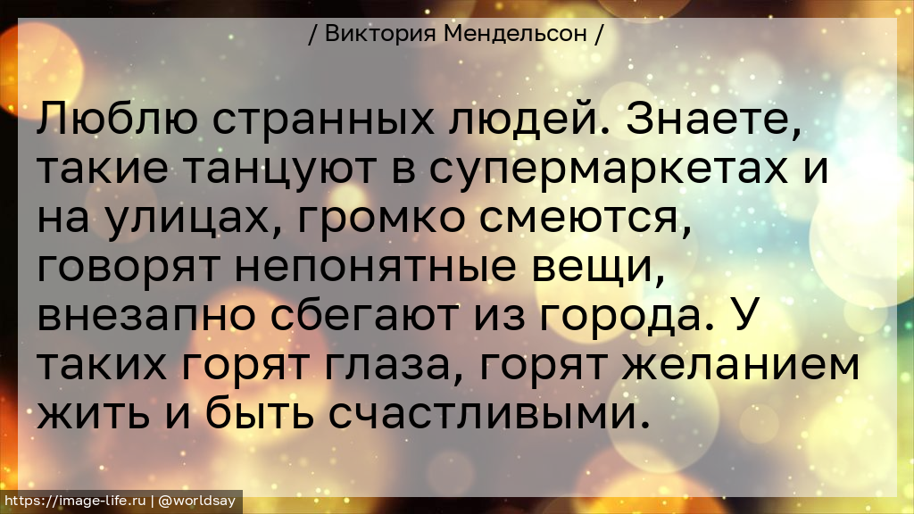 Люблю странных людей. Знаете, такие танцуют в супермаркетах и на улицах, громко смеются, говорят непонятные вещи, внезапно сбегают из города. У таких горят глаза, горят желанием жить и быть счастливыми.