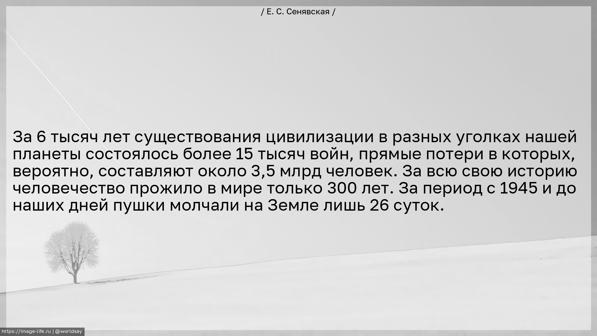 За 6 тысяч лет существования цивилизации в разных уголках нашей планеты состоялось более 15 тысяч войн, прямые потери в которых, вероятно, составляют около 3,5 млрд человек. За всю свою историю человечество прожило в мире только 300 лет. За период с 1945 и до наших дней пушки молчали на Земле лишь 26 суток.