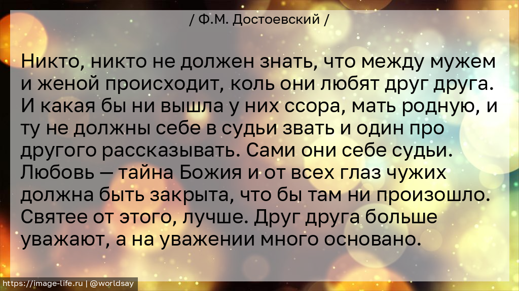 Никто, никто не должен знать, что между мужем и женой происходит, коль они любят друг друга. И какая бы ни вышла у них ссора, мать родную, и ту не должны себе в судьи звать и один про другого рассказывать. Сами они себе судьи. Любовь — тайна Божия и от всех глаз чужих должна быть закрыта, что бы там ни произошло. Святее от этого, лучше. Друг друга больше уважают, а на уважении много основано.