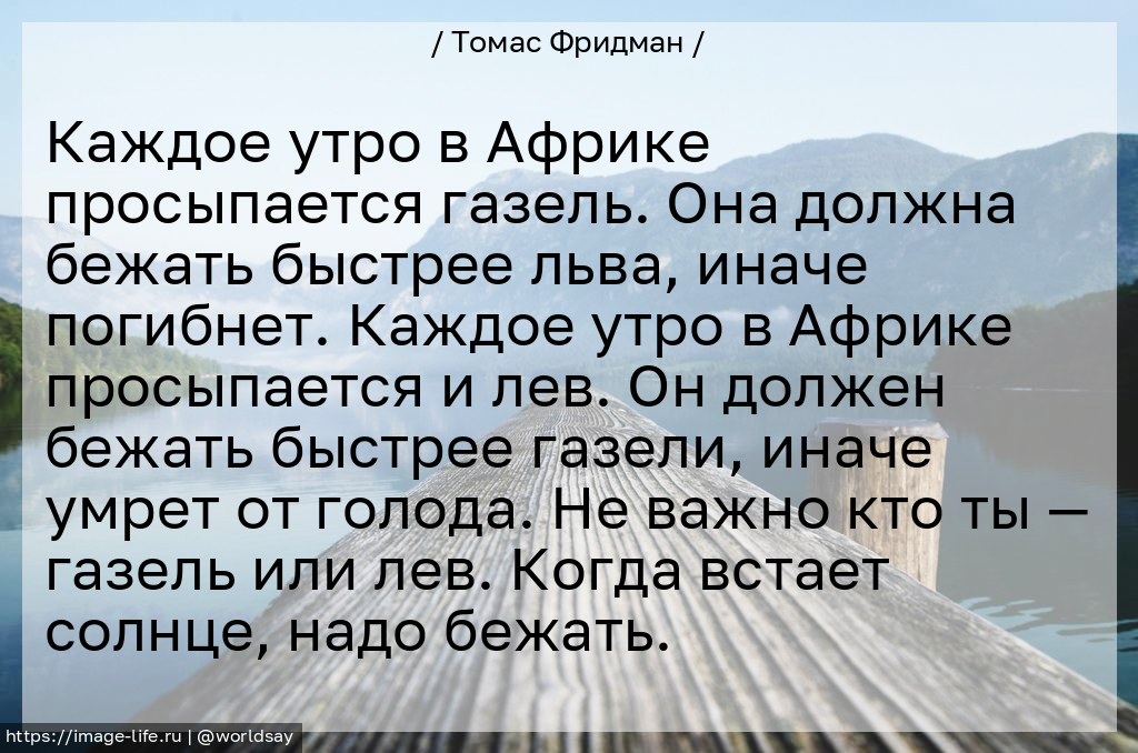 Каждое утро в Африке просыпается газель. Она должна бежать быстрее льва, иначе погибнет. Каждое утро в Африке просыпается и лев. Он должен бежать быстрее газели, иначе умрет от голода. Не важно кто ты — газель или лев. Когда встает солнце, надо бежать.