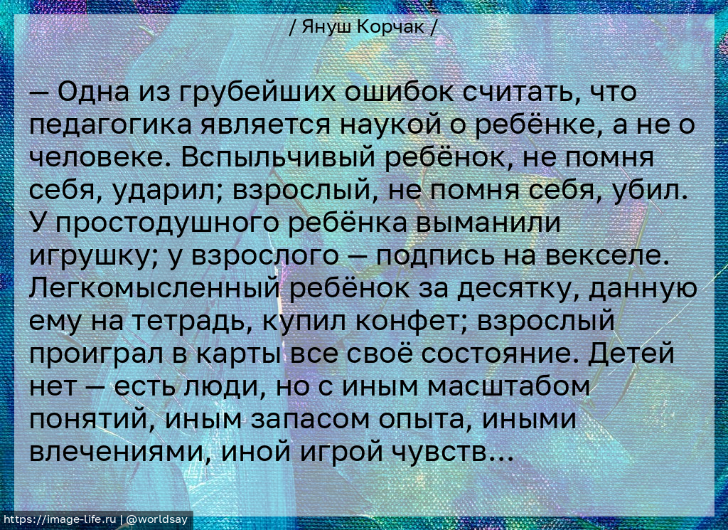 — Одна из грубейших ошибок считать, что педагогика является наукой о ребёнке, а не о человеке. Вспыльчивый ребёнок, не помня себя, ударил; взрослый, не помня себя, убил. У простодушного ребёнка выманили игрушку; у взрослого — подпись на векселе. Легкомысленный ребёнок за десятку, данную ему на тетрадь, купил конфет; взрослый проиграл в карты все своё состояние. Детей нет — есть люди, но с иным масштабом понятий, иным запасом опыта, иными влечениями, иной игрой чувств…