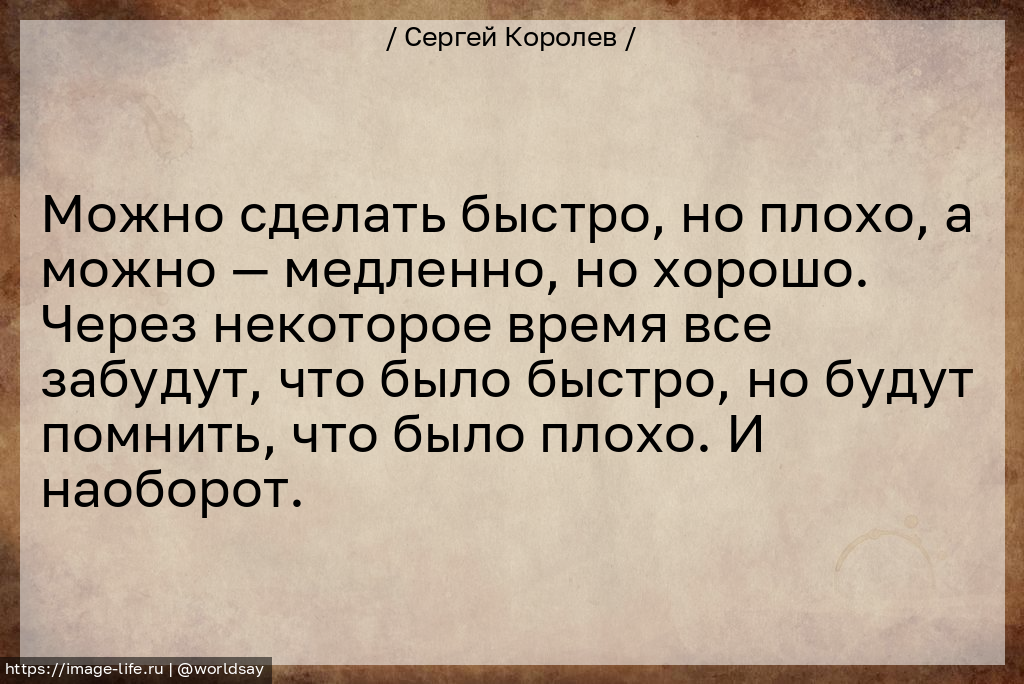 Можно сделать быстро, но плохо, а можно — медленно, но хорошо. Через некоторое время все забудут, что было быстро, но будут помнить, что было плохо. И наоборот.