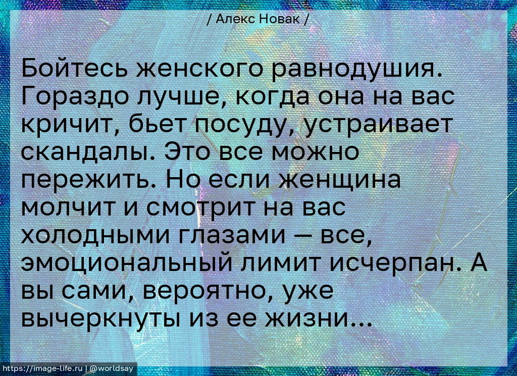 Бойтесь женского равнодушия. Гораздо лучше, когда она на вас кричит, бьет посуду, устраивает скандалы. Это все можно пережить. Но если женщина молчит и смотрит на вас холодными глазами — все, эмоциональный лимит исчерпан. А вы сами, вероятно, уже вычеркнуты из ее жизни...