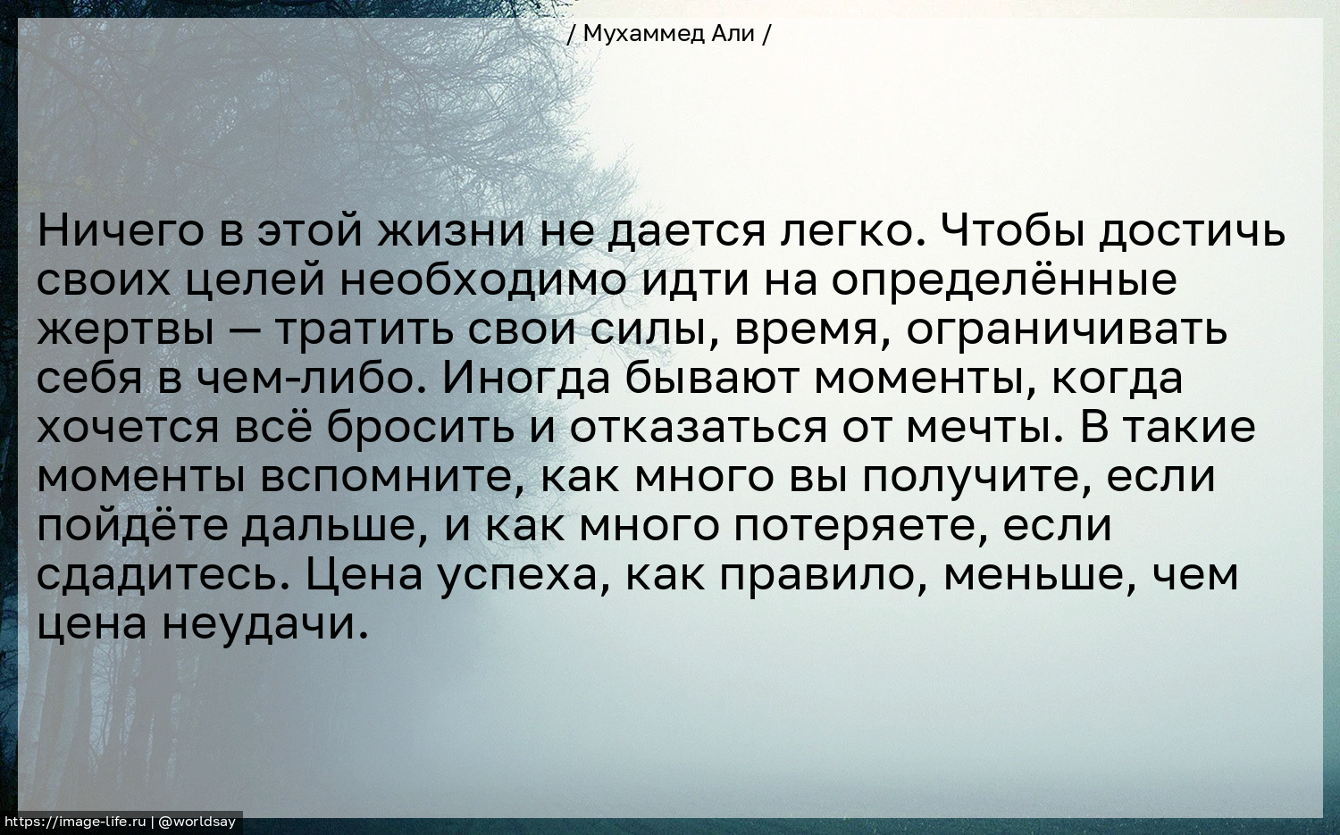 Ничего в этой жизни не дается легко. Чтобы достичь своих целей необходимо идти на определённые жертвы — тратить свои силы, время, ограничивать себя в чем-либо. Иногда бывают моменты, когда хочется всё бросить и отказаться от мечты. В такие моменты вспомните, как много вы получите, если пойдёте дальше, и как много потеряете, если сдадитесь. Цена успеха, как правило, меньше, чем цена неудачи.