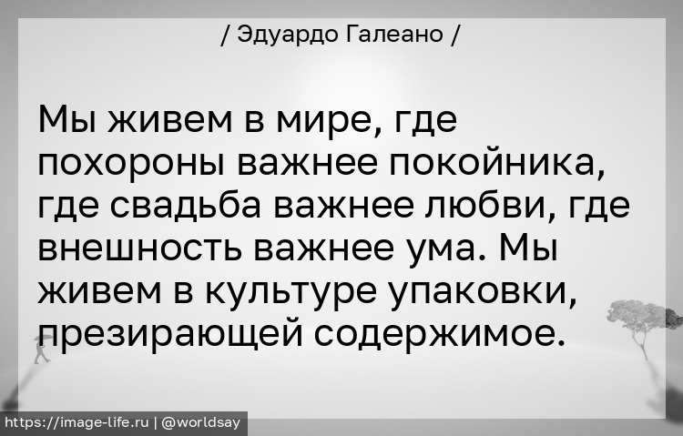 Мы живем в мире, где похороны важнее покойника, где свадьба важнее любви, где внешность важнее ума. Мы живем в культуре упаковки, презирающей содержимое.