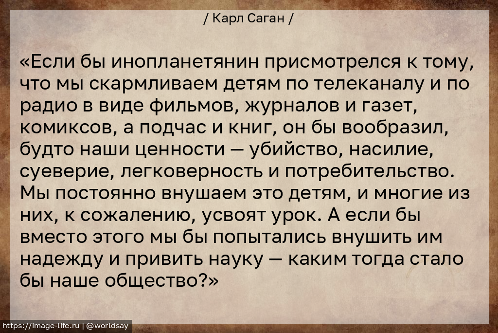 «Если бы инопланетянин присмотрелся к тому, что мы скармливаем детям по телеканалу и по радио в виде фильмов, журналов и газет, комиксов, а подчас и книг, он бы вообразил, будто наши ценности — убийство, насилие, суеверие, легковерность и потребительство. Мы постоянно внушаем это детям, и многие из них, к сожалению, усвоят урок. А если бы вместо этого мы бы попытались внушить им надежду и привить науку — каким тогда стало бы наше общество?»