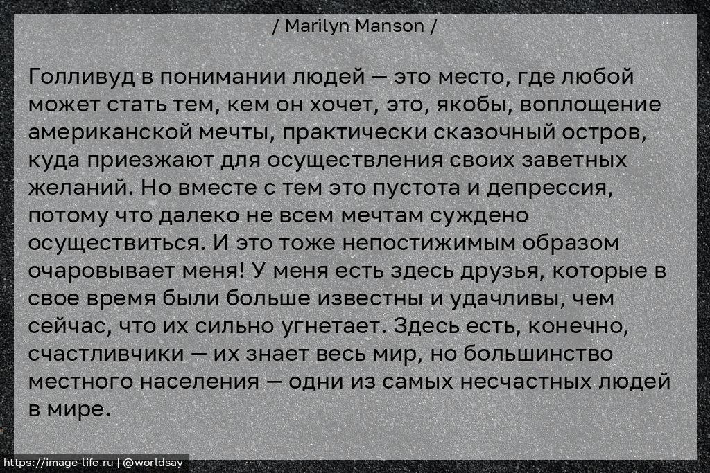 Голливуд в понимании людей — это место, где любой может стать тем, кем он хочет, это, якобы, воплощение американской мечты, практически сказочный остров, куда приезжают для осуществления своих заветных желаний. Но вместе с тем это пустота и депрессия, потому что далеко не всем мечтам суждено осуществиться. И это тоже непостижимым образом очаровывает меня! У меня есть здесь друзья, которые в свое время были больше известны и удачливы, чем сейчас, что их сильно угнетает. Здесь есть, конечно, счастливчики — их знает весь мир, но большинство местного населения — одни из самых несчастных людей в мире.