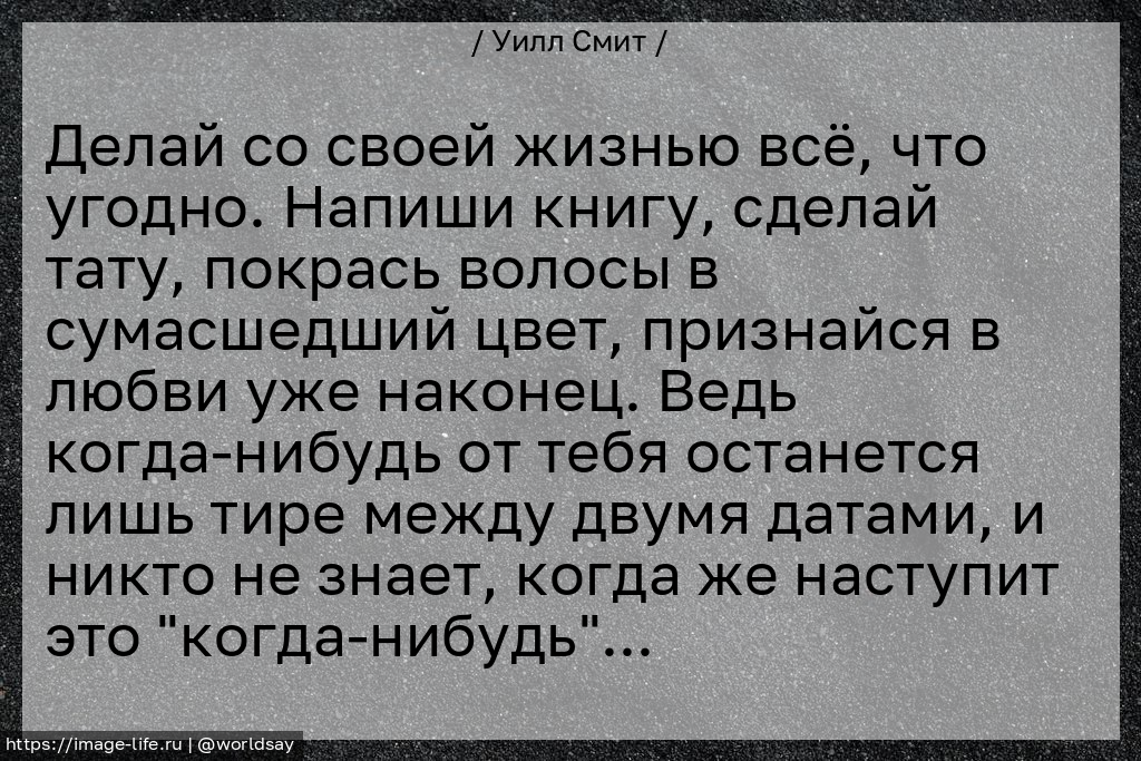 Делай со своей жизнью всё, что угодно. Напиши книгу, сделай тату, покрась волосы в сумасшедший цвет, признайся в любви уже наконец. Ведь когда-нибудь от тебя останется лишь тире между двумя датами, и никто не знает, когда же наступит это "когда-нибудь"...