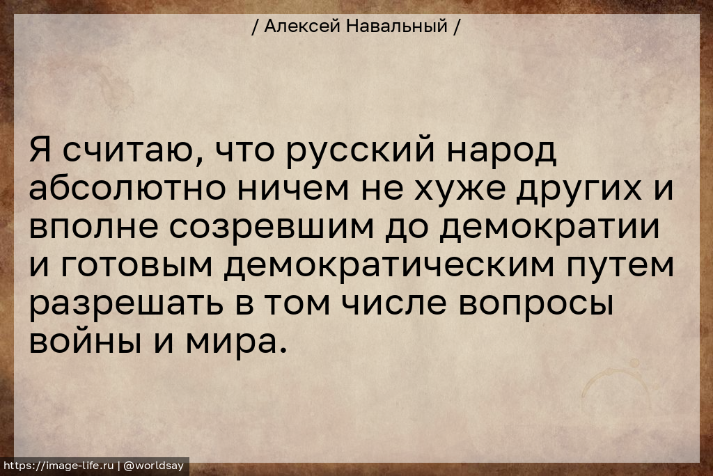Я считаю, что русский народ абсолютно ничем не хуже других и вполне созревшим до демократии и готовым демократическим путем разрешать в том числе вопросы войны и мира.