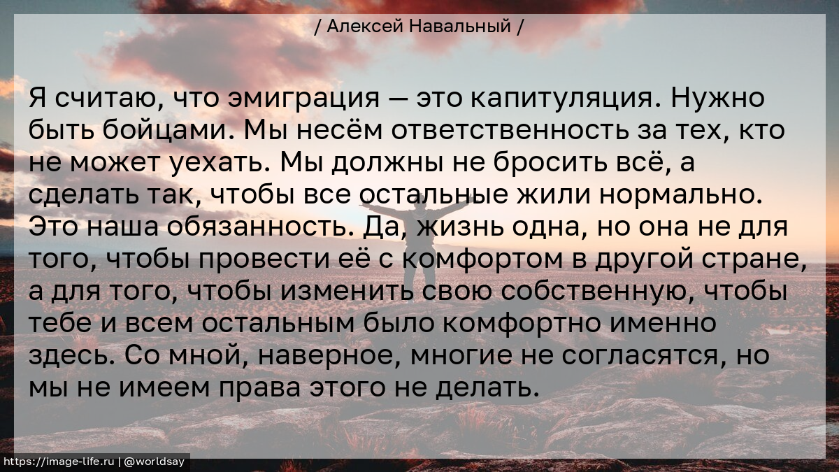 Я считаю, что эмиграция — это капитуляция. Нужно быть бойцами. Мы несём ответственность за тех, кто не может уехать. Мы должны не бросить всё, а сделать так, чтобы все остальные жили нормально. Это наша обязанность. Да, жизнь одна, но она не для того, чтобы провести её с комфортом в другой стране, а для того, чтобы изменить свою собственную, чтобы тебе и всем остальным было комфортно именно здесь. Со мной, наверное, многие не согласятся, но мы не имеем права этого не делать.