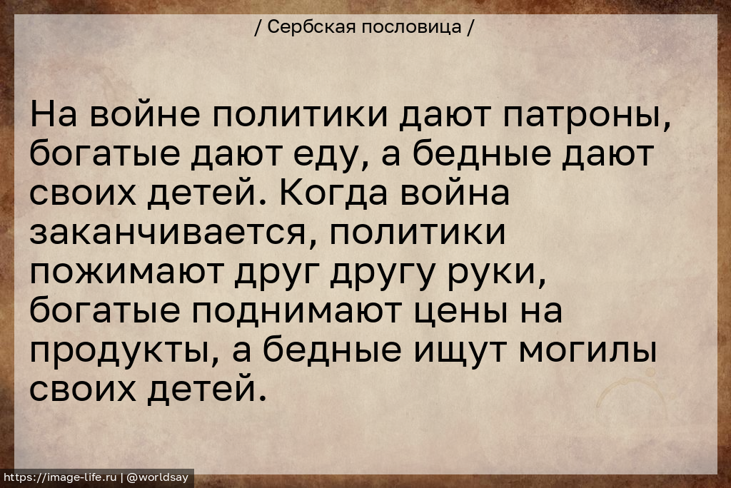 На войне политики дают патроны, богатые дают еду, а бедные дают своих детей. Когда война заканчивается, политики пожимают друг другу руки, богатые поднимают цены на продукты, а бедные ищут могилы своих детей.