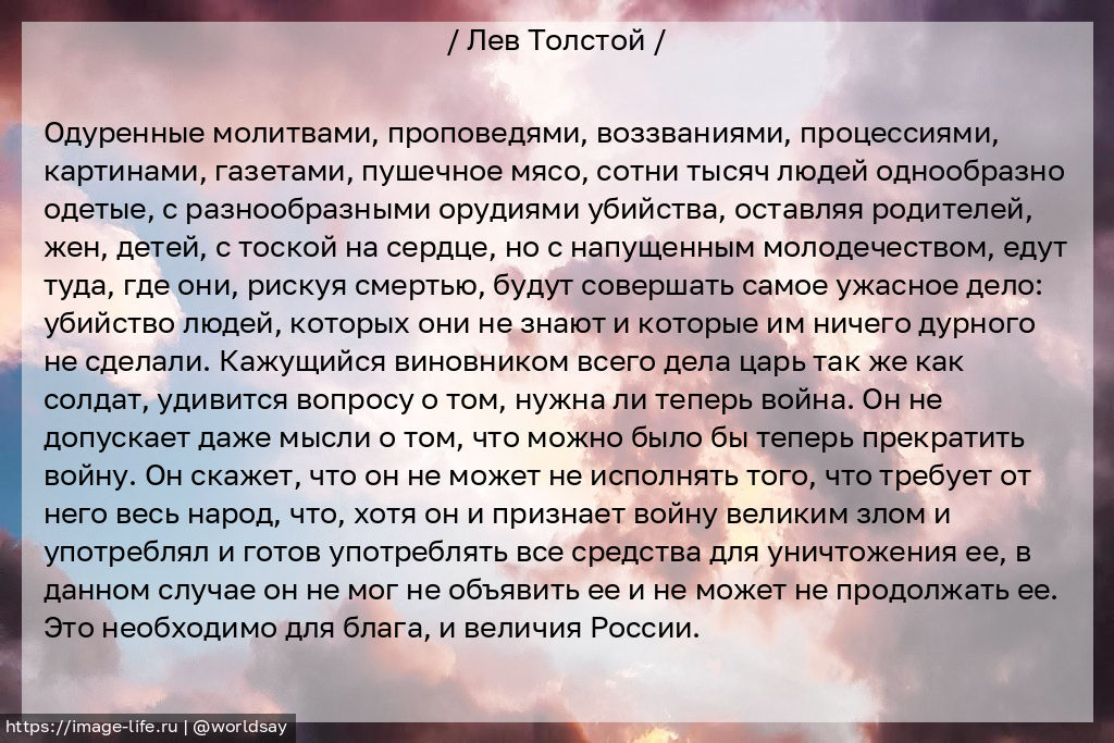 Одуренные молитвами, проповедями, воззваниями, процессиями, картинами, газетами, пушечное мясо, сотни тысяч людей однообразно одетые, с разнообразными орудиями убийства, оставляя родителей, жен, детей, с тоской на сердце, но с напущенным молодечеством, едут туда, где они, рискуя смертью, будут совершать самое ужасное дело: убийство людей, которых они не знают и которые им ничего дурного не сделали. Кажущийся виновником всего дела царь так же как солдат, удивится вопросу о том, нужна ли теперь война. Он не допускает даже мысли о том, что можно было бы теперь прекратить войну. Он скажет, что он не может не исполнять того, что требует от него весь народ, что, хотя он и признает войну великим злом и употреблял и готов употреблять все средства для уничтожения ее, в данном случае он не мог не объявить ее и не может не продолжать ее. Это необходимо для блага, и величия России.