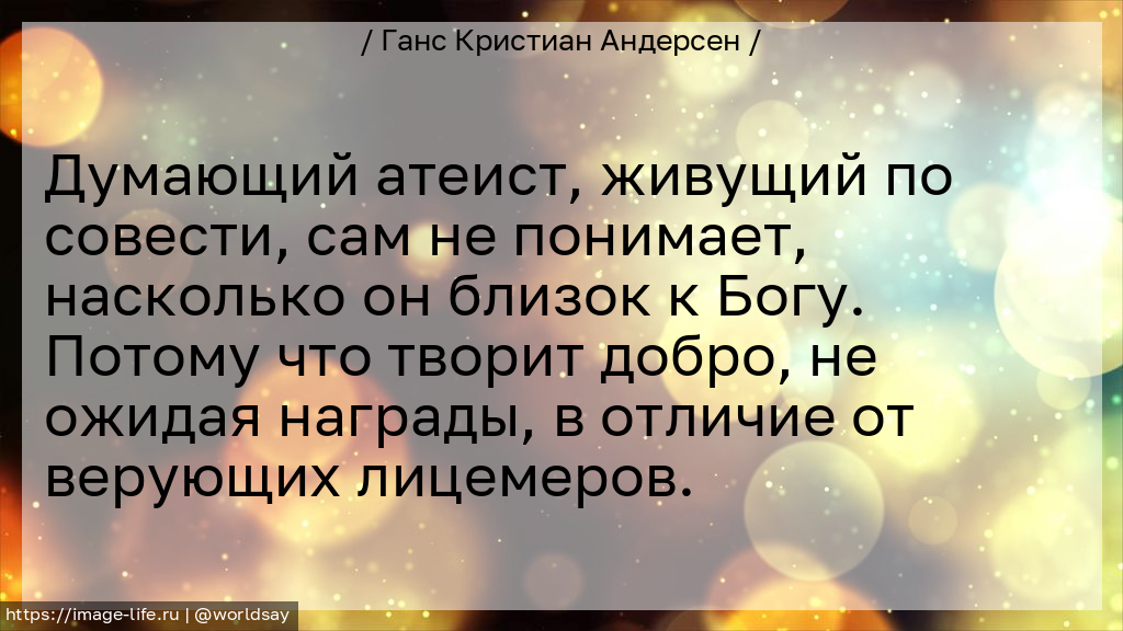 Думающий атеист, живущий по совести, сам не понимает, насколько он близок к Богу. Потому что творит добро, не ожидая награды, в отличие от верующих лицемеров.