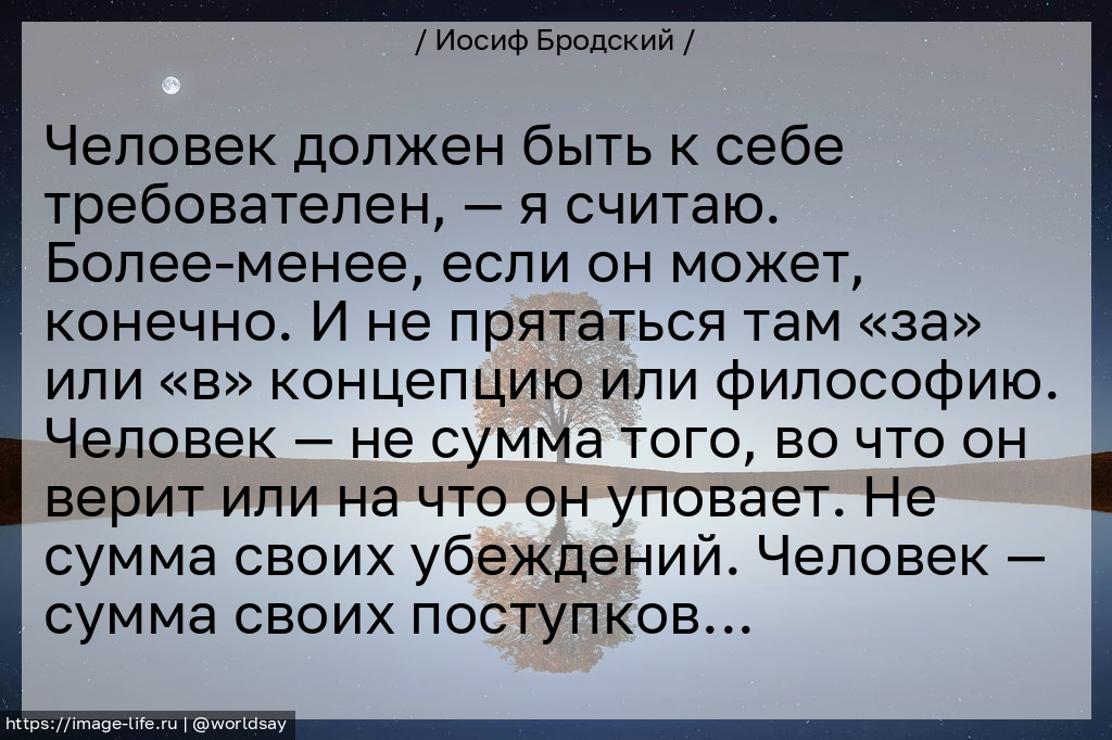 Человек должен быть к себе требователен, — я считаю. Более-менее, если он может, конечно. И не прятаться там «за» или «в» концепцию или философию. Человек — не сумма того, во что он верит или на что он уповает. Не сумма своих убеждений. Человек — сумма своих поступков…