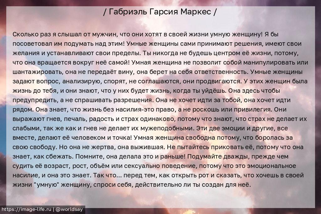 Сколько раз я слышал от мужчин, что они хотят в своей жизни умную женщину! Я бы посоветовал им подумать над этим! Умные женщины сами принимают решения, имеют свои желания и устанавливают свои пределы. Ты никогда не будешь центром её жизни, потому, что она вращается вокруг неё самой! Умная женщина не позволит собой манипулировать или шантажировать, она не передаёт вину, она берет на себя ответственность. Умные женщины задают вопрос, анализирую, спорят, не соглашаются, они продвигаются. У этих женщин была жизнь до тебя, и они знают, что у них будет жизнь, когда ты уйдёшь. Она здесь чтобы предупредить, а не спрашивать разрешения. Она не хочет идти за тобой, она хочет идти рядом. Она знает, что жизнь без насилия-это право, а не роскошь или привилегия. Они выражают гнев, печаль, радость и страх одинаково, потому что знают, что страх не делает их слабыми, так же как и гнев не делает их мужеподобными. Эти две эмоции и другие, все вместе, делают её человеком и точка! Умная женщина свободна потому, что боролась за свою свободу. Но она не жертва, она выжившая. Не пытайтесь приковать её, потому что она знает, как сбежать. Помните, она делала это и раньше! Подумайте дважды, прежде чем судить её возраст, рост, объём или сексуально поведение, потому что это эмоциональное насилие, и она это знает. Так что... перед тем, как открыть рот и сказать, что хочешь в своей жизни "умную" женщину, спроси себя, действительно ли ты создан для неё.