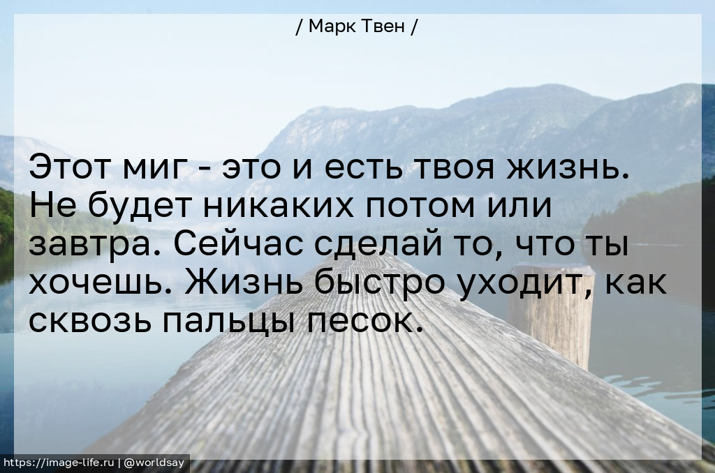 Этот миг - это и есть твоя жизнь. Не будет никаких потом или завтра. Сейчас сделай то, что ты хочешь. Жизнь быстро уходит, как сквозь пальцы песок.