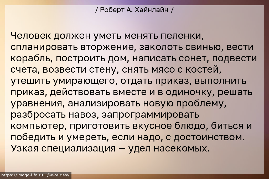 Человек должен уметь менять пеленки, спланировать вторжение, заколоть свинью, вести корабль, построить дом, написать сонет, подвести счета, возвести стену, снять мясо с костей, утешить умирающего, отдать приказ, выполнить приказ, действовать вместе и в одиночку, решать уравнения, анализировать новую проблему, разбросать навоз, запрограммировать компьютер, приготовить вкусное блюдо, биться и победить и умереть, если надо, с достоинством. Узкая специализация — удел насекомых.
