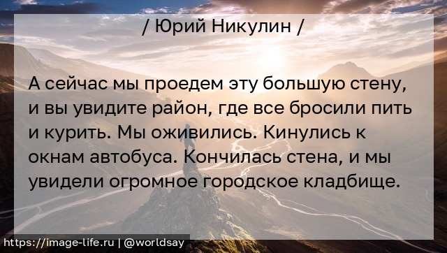 А сейчас мы проедем эту большую стену, и вы увидите район, где все бросили пить и курить. Мы оживились. Кинулись к окнам автобуса. Кончилась стена, и мы увидели огромное городское кладбище.