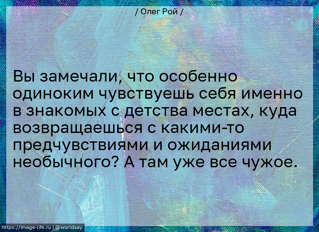 Вы замечали, что особенно одиноким чувствуешь себя именно в знакомых с детства местах, куда возвращаешься с какими-то предчувствиями и ожиданиями необычного? А там уже все чужое.